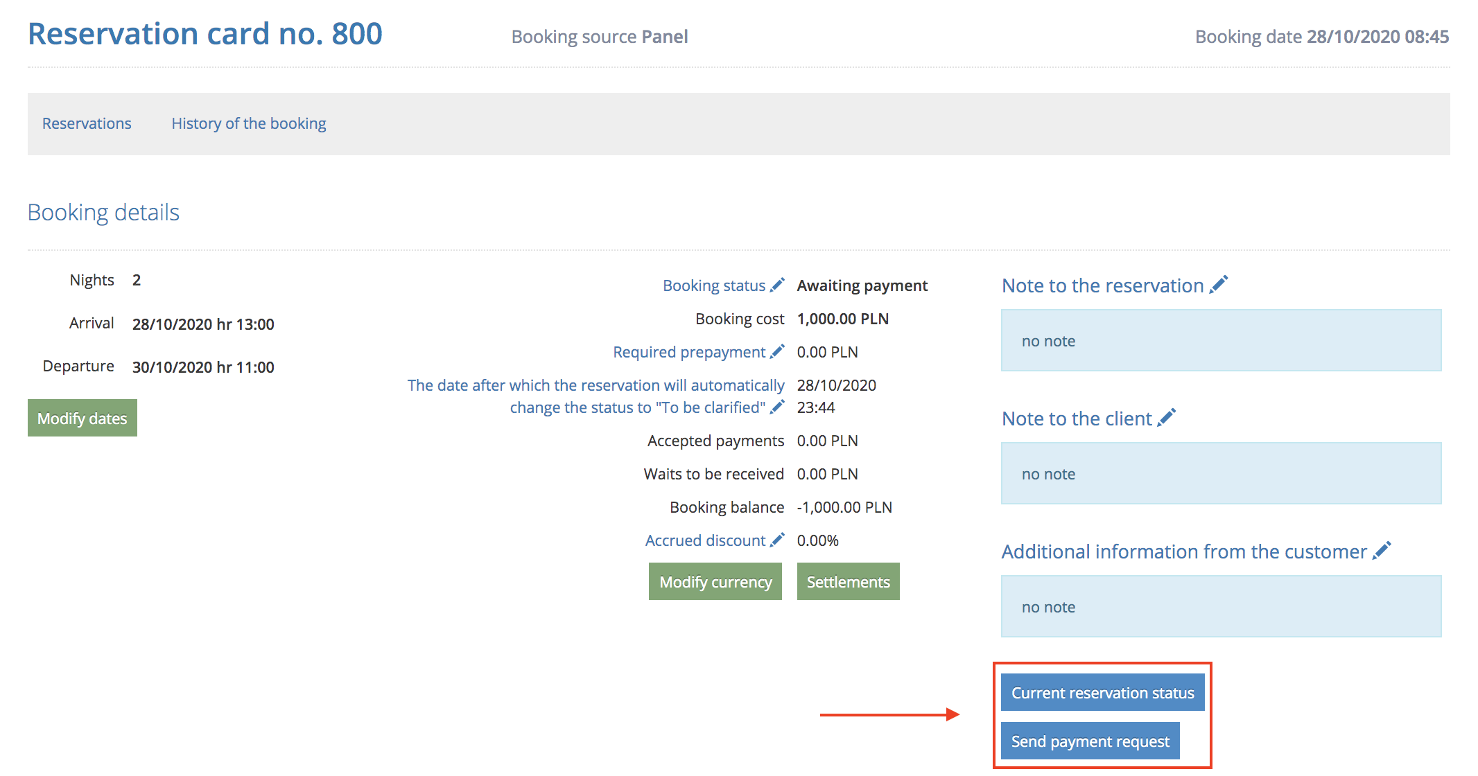 You can send these messages directly from the reservation details if you want to collect a payment or inform the booking person about changes to the booking.
