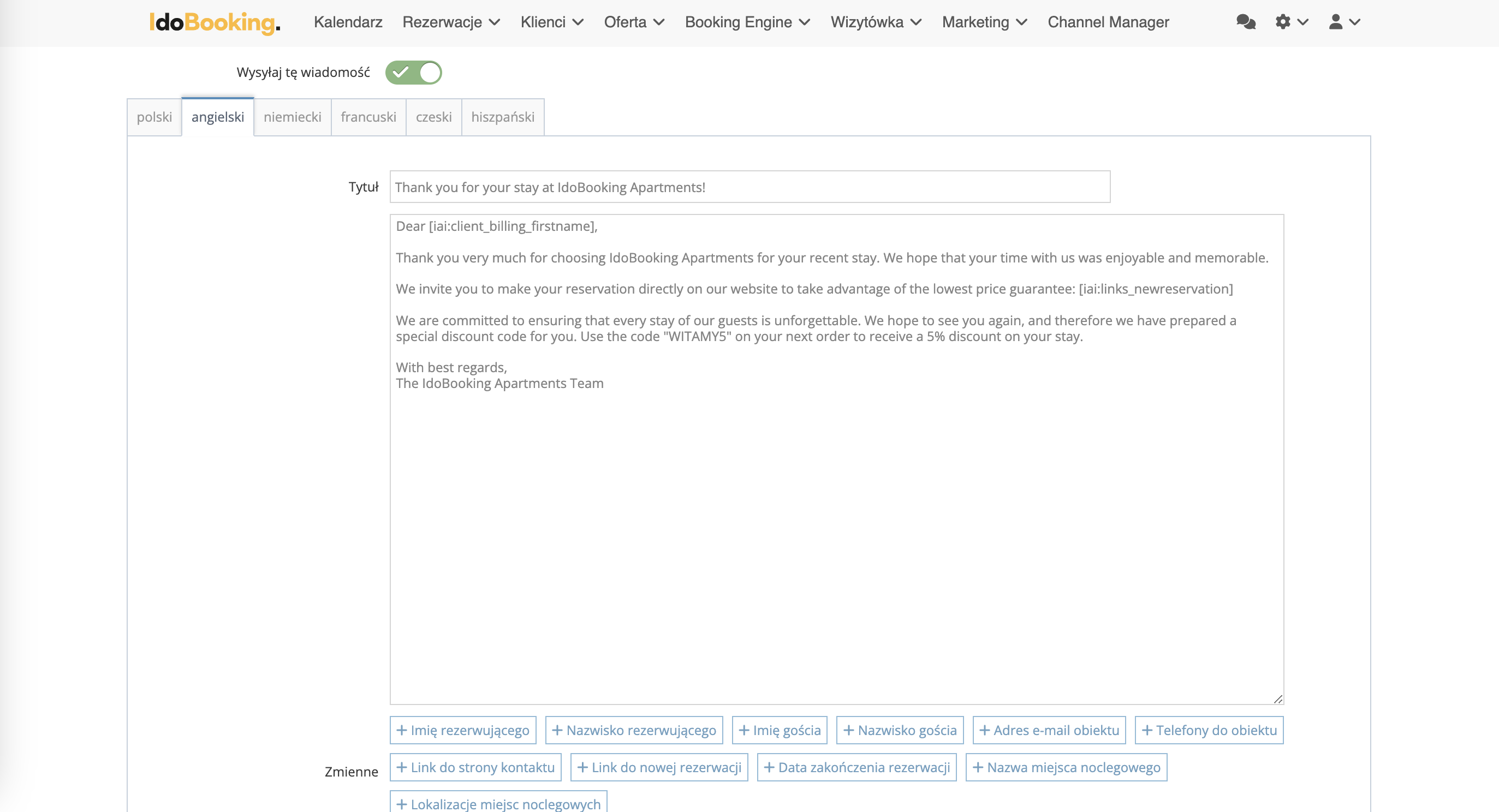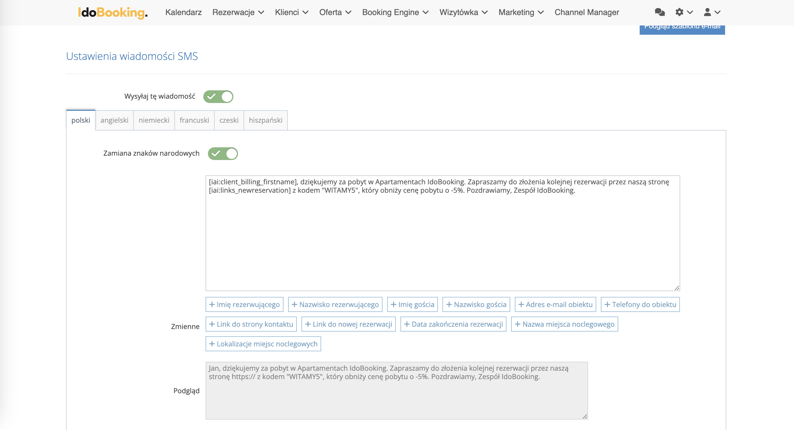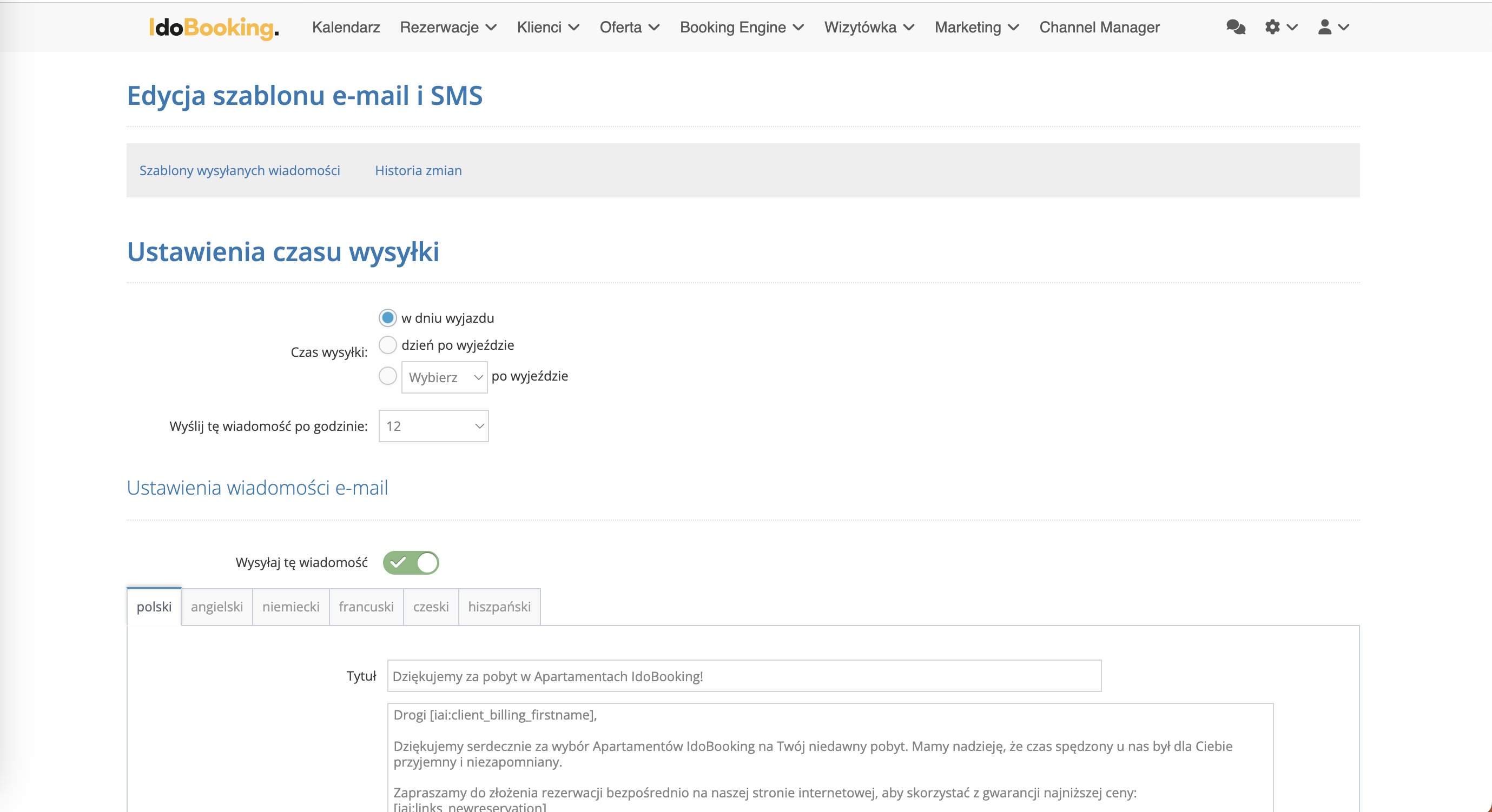 • Wiadomości mają różne wersje językowe, co pozwoli wysyłać treści dopasowane do narodowości Gości